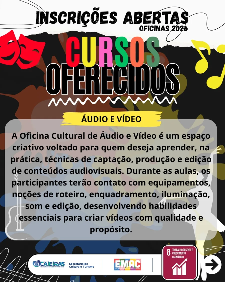 A Prefeitura de Caieiras iniciou o período de inscrições para oficinas culturais gratuitas voltadas às áreas de áudio, vídeo e breakdance. As atividades são destinadas a iniciantes e têm como objetivo estimular a criatividade, o trabalho em equipe e o desenvolvimento de habilidades técnicas.