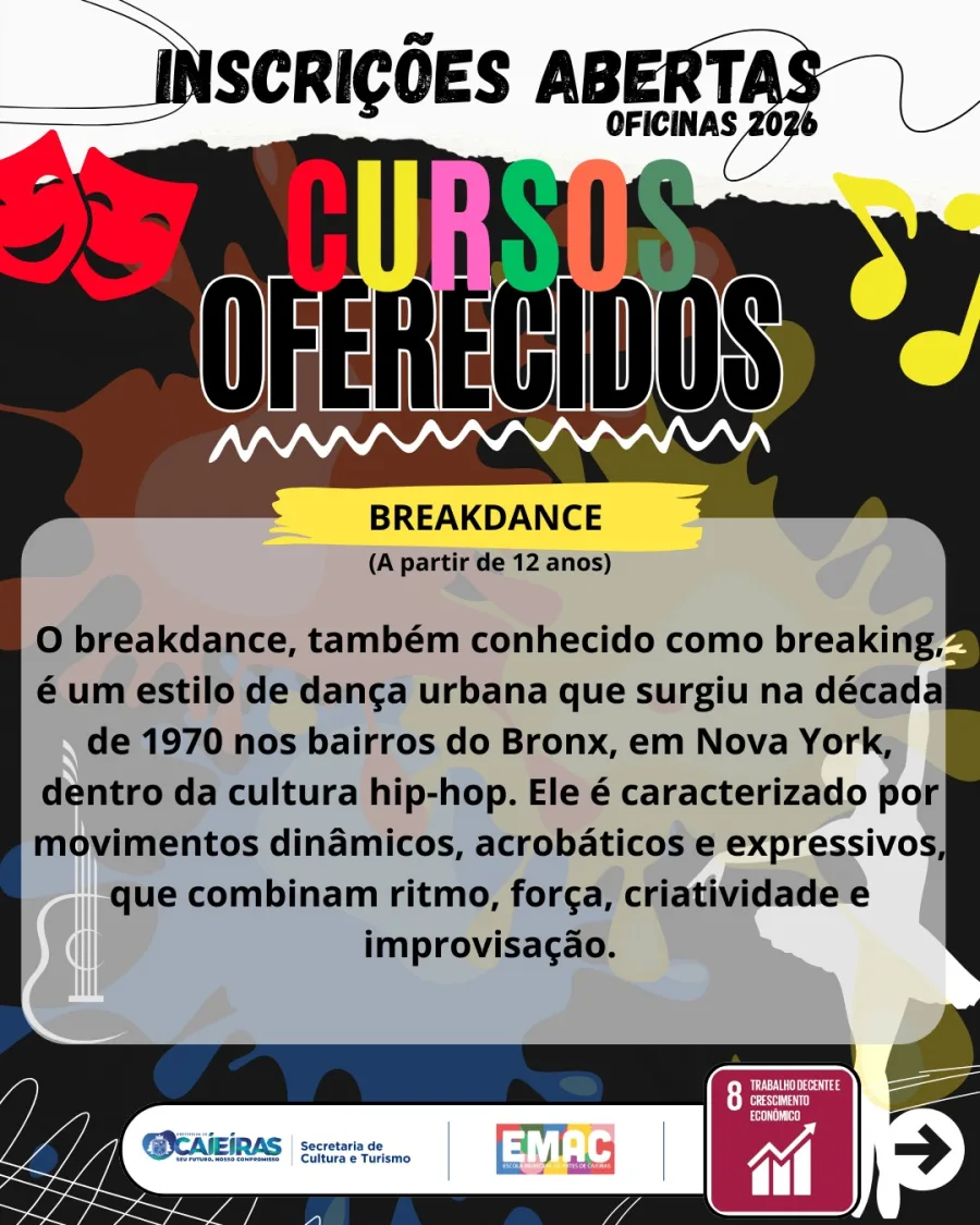 A cidade de Caieiras abriu inscrições para oficinas culturais gratuitas nas áreas de áudio, vídeo e breakdance, com vagas destinadas a iniciantes interessados em desenvolver habilidades criativas.