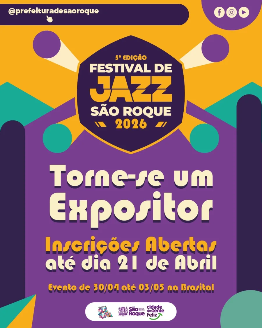 A Prefeitura de São Roque abriu o período de inscrições para empreendedores interessados em participar como expositores na edição 2026 do Festival de Jazz. O evento, considerado um dos principais do calendário cultural do município, será realizado entre os dias 30 de abril e 3 de maio, no espaço Brasital.
